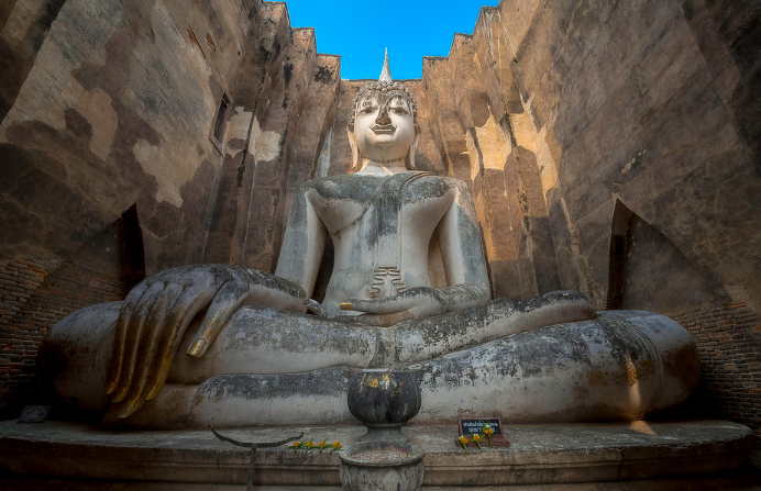 Phra Achana 是素可泰古城最美丽的佛像之一。这座大型坐像位于 Wat Si Chum,其名字的意思是“不受惊吓的人”。当地传说称,缅甸军队看到这座雕像后就投降了。这座雕像之所以如此具有视觉吸引力,部分原因在于它的背景。它坐落在一个现在没有屋顶的大大厅里,通过一个高而细长的开口可以看到部分雕像。修长的手指上涂有金箔,以求好运。